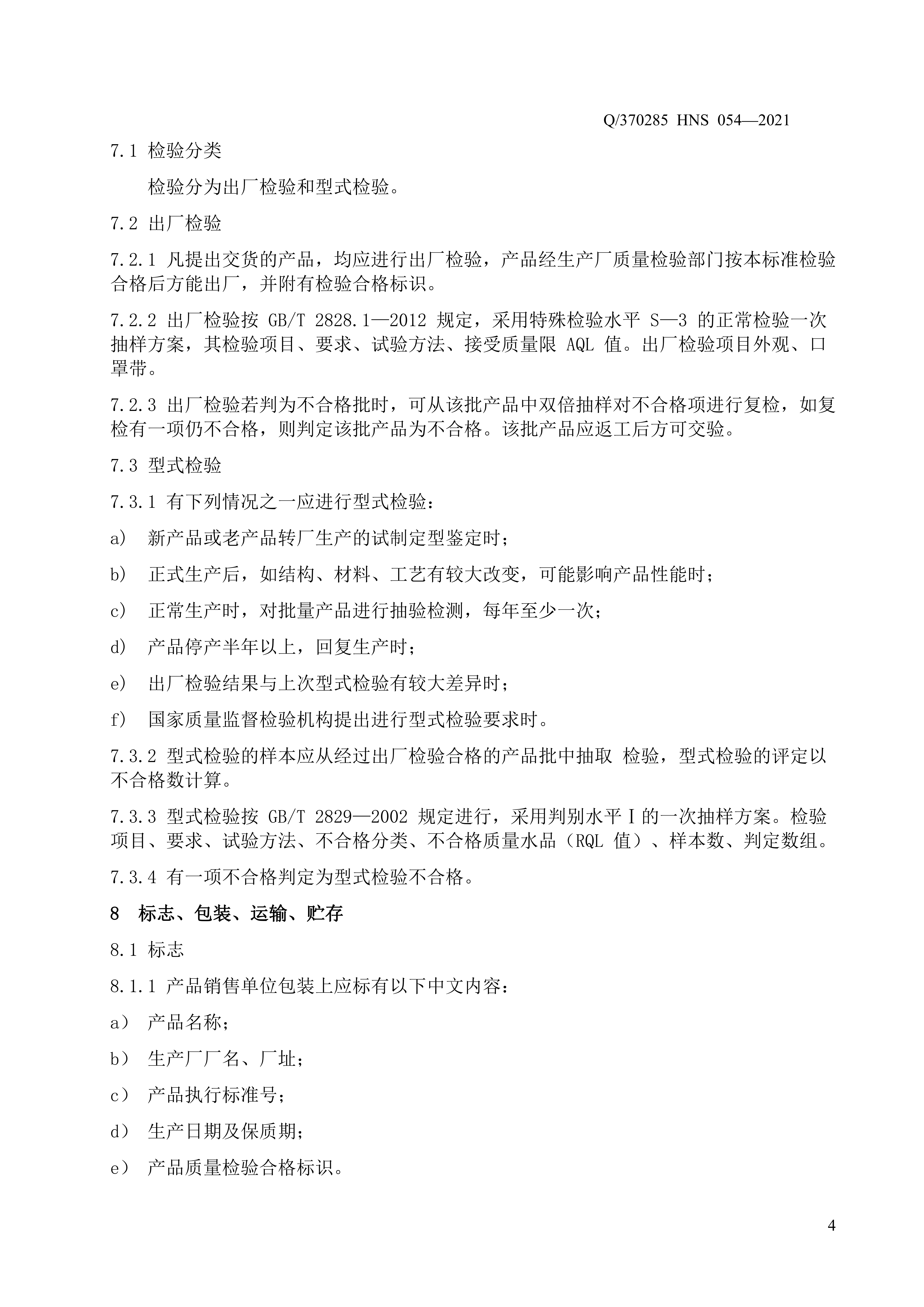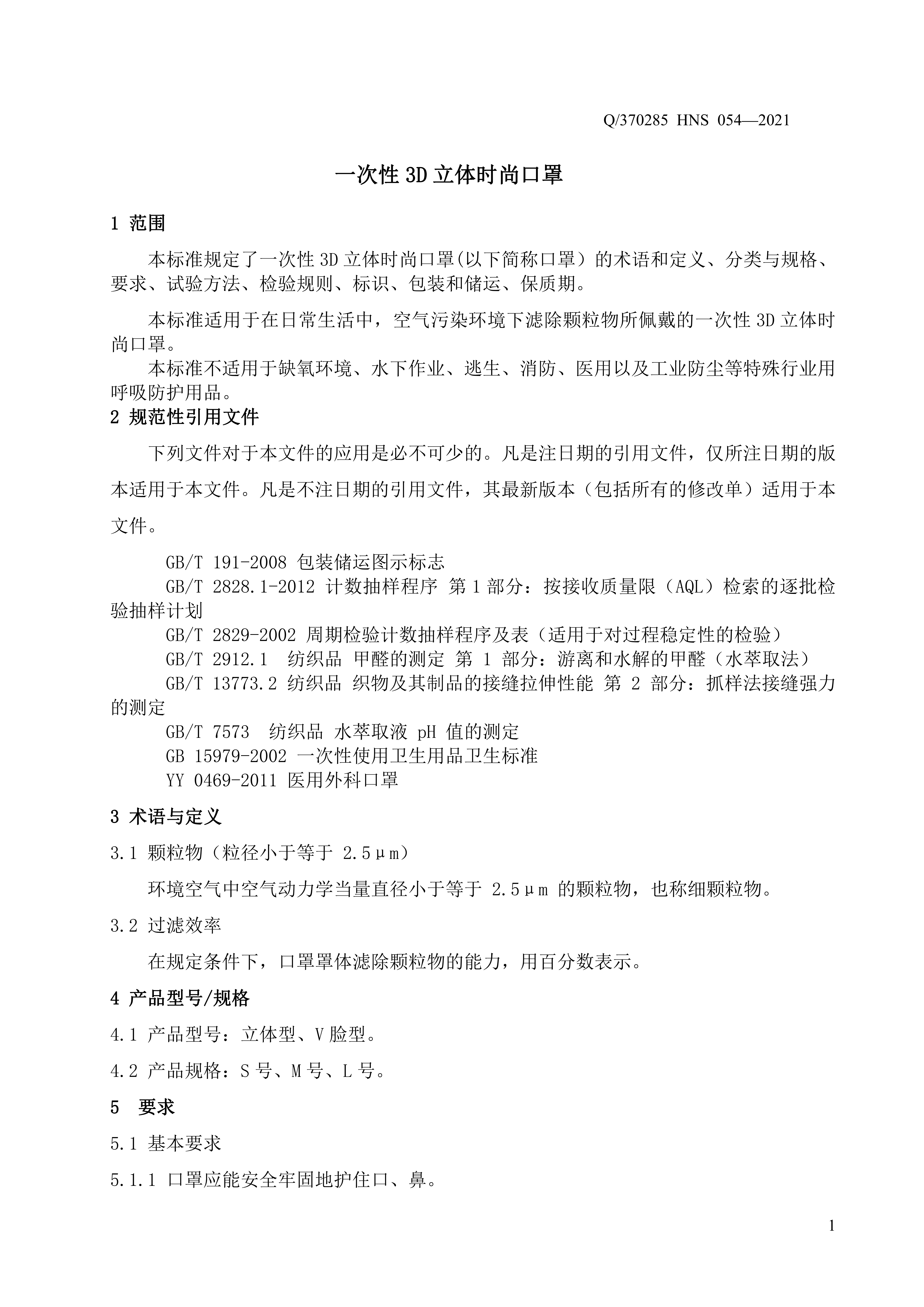 青岛海诺生物工程有限公司企业标准 — 一次性 3D 立体时尚口罩